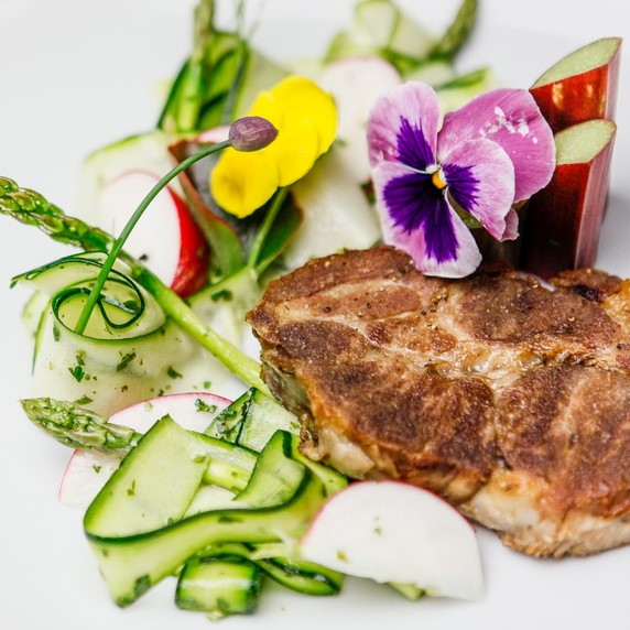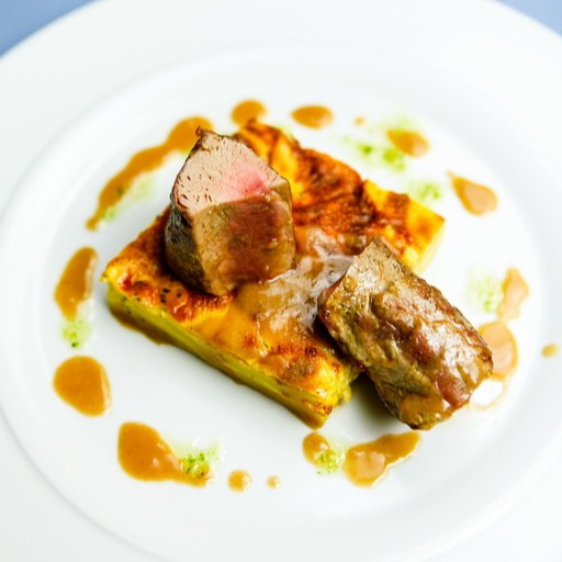 Rosé szűzpecsenye, zöldséges tócsni, aszús hagymalekvár (5.990 Ft)