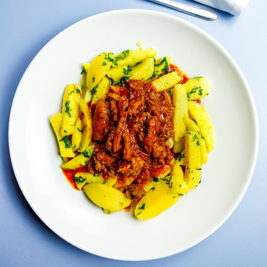 Beef stew with cottage cheese pasta dumplings (sztrapacska)